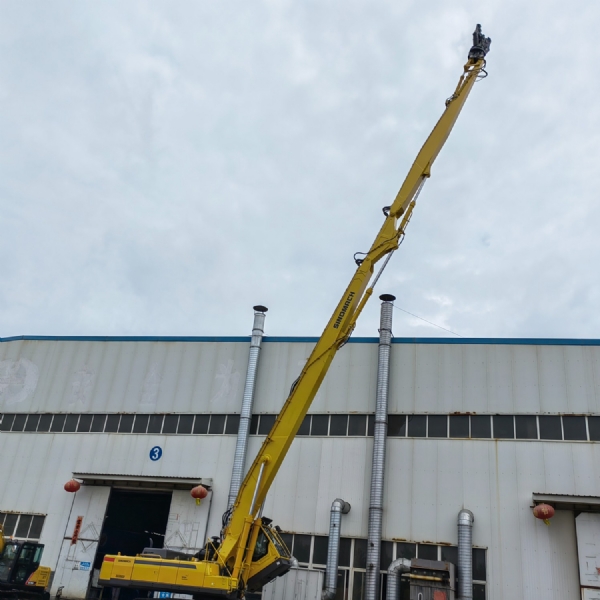 40-50吨位发掘机加长臂,可加长到26米,其设置装备摆设为:挖斗1个、铲斗油缸1支、销轴6支、 高压软管4条、黄油管3条、连杆总成1套、运输连杆1套、加长大臂(14米)、加长小臂(12米)。
